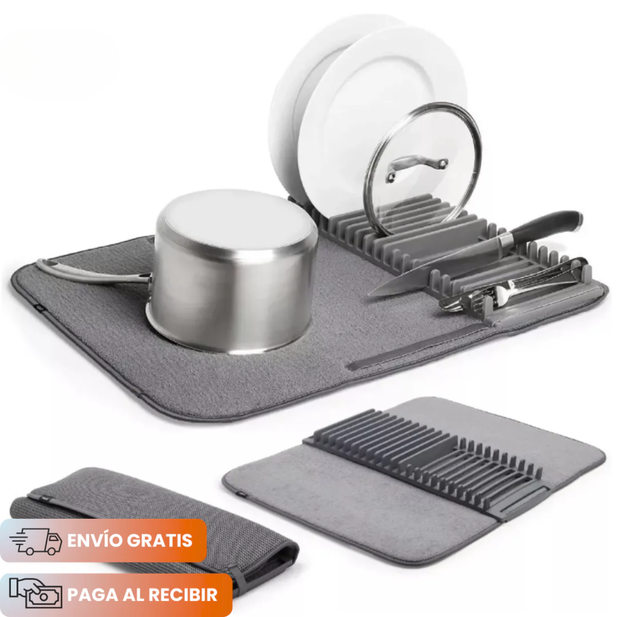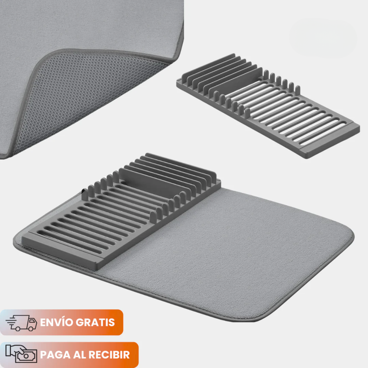 Este innovador escurridor 2 en 1 combina un estante de drenaje de alta resistencia con una alfombrilla absorbente de poliéster, pensada para eliminar el exceso de agua sin dejar rastros.