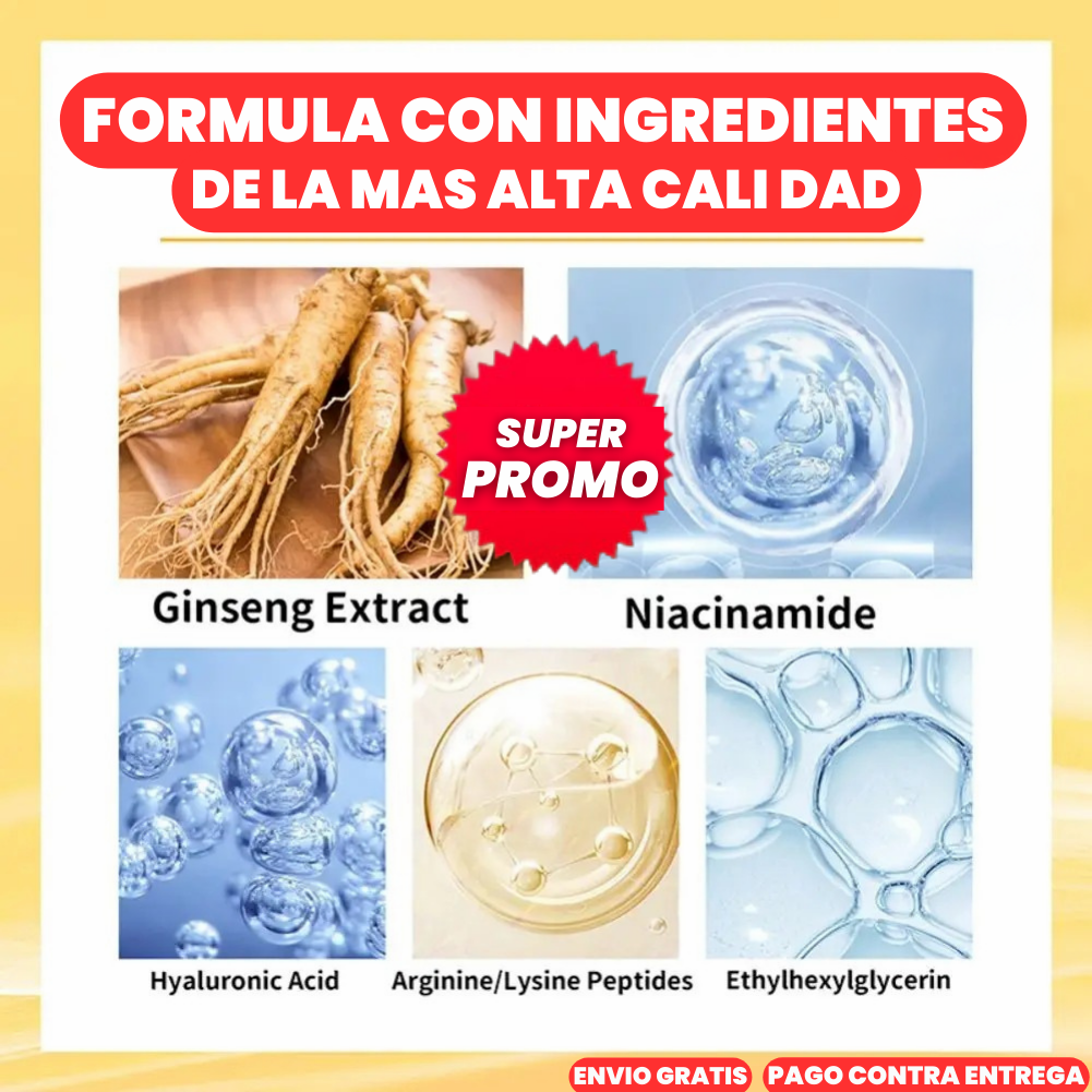 Al estimular la producción de colágeno y mejorar la elasticidad de la piel, Ginseng reduce significativamente los signos del envejecimiento, devolviendo a tu piel su juventud y vitalidad en pocas semanas.